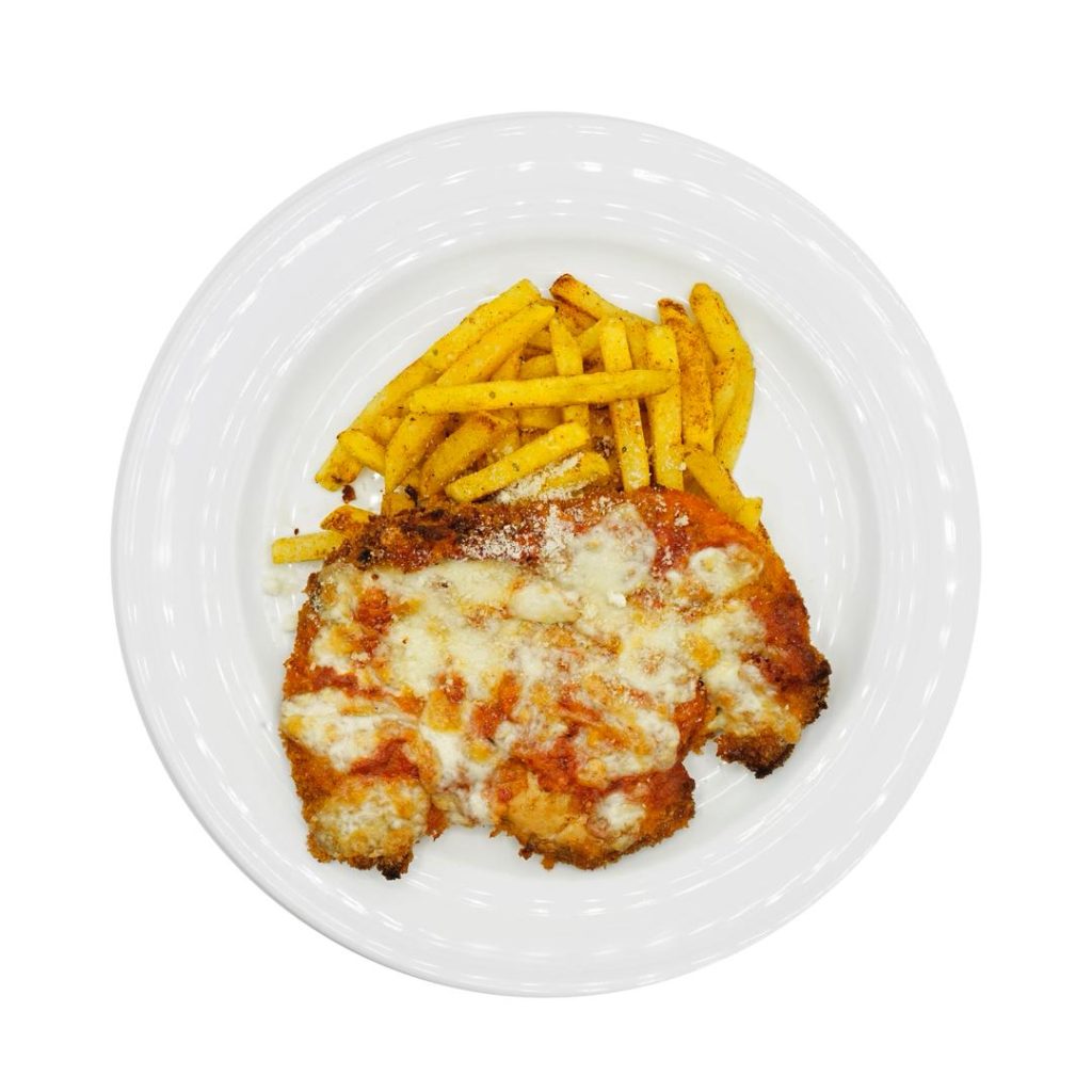 با پاستا یا فرایز: شنیتسل سینه مرغ-سس گوجهفرنگی تازه-پنیر مازرلا و پارمژان